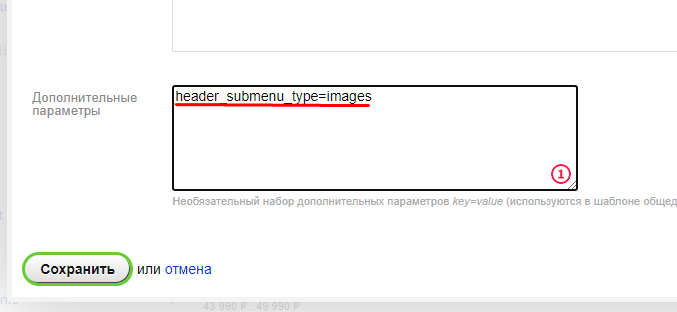 4. Есть возможность индивидуально для категории задать вид, используя поле Дополнительные параметры в настройках категории. С новой строки вставьте параметр header_submenu_type=вид подменю: