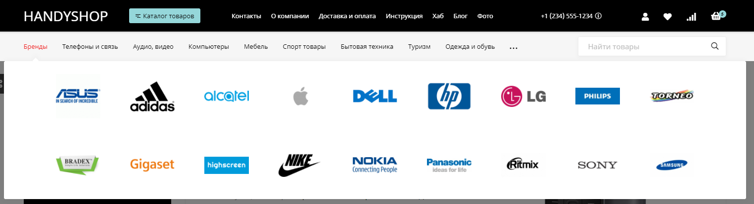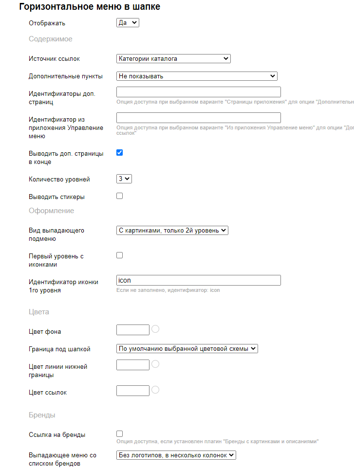 5. Для вывода пункта меню Бренды, включите опцию "Ссылка на бренды" и настройте вид выпадающего меню, доступны варианты: