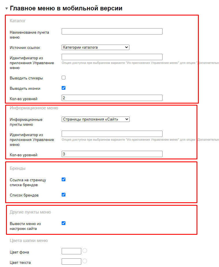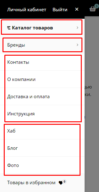 1. Мобильное меню состоит из нескольких разделов: Каталог, Бренды, Информационное меню и меню из настроек сайта.