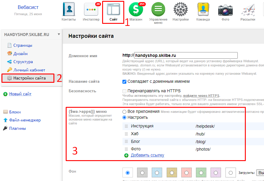 5. Ссылки из настроек сайта управляются в приложении Сайт - Настройки: