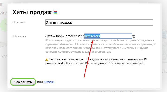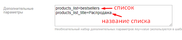 4. В редактировании товара, в опции Дополнительные параметры, с новой строчки вставьте параметр products_list со значением идентификатора, скопированного в предыдущем шаге инструкции: products_list=bestsellers