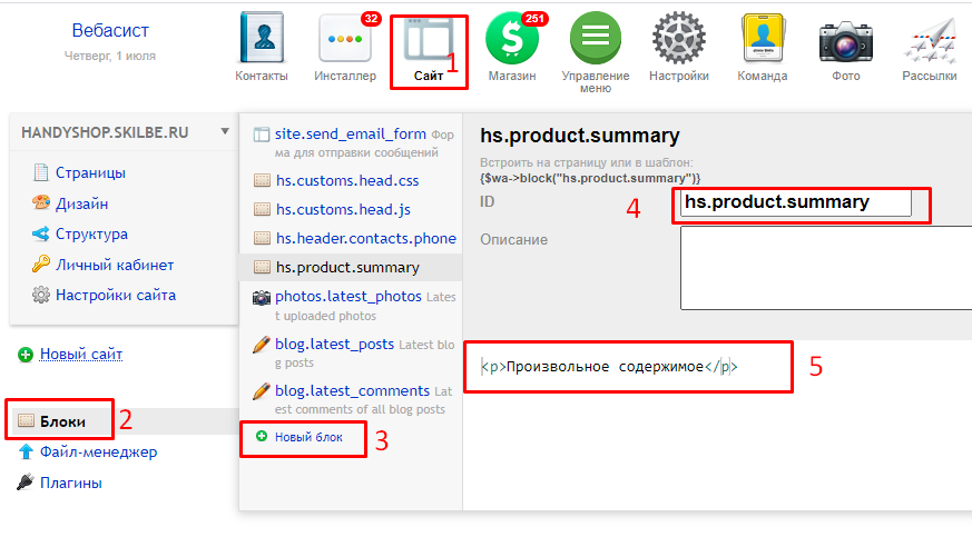В карточке товара предусмотрены блоки в разных местах для произвольного содержимого. Для создания блока перейдите в приложение Сайт -> Блоки -> Новый блок. В поле ID необходимо ввести идентификатор блока, а содержимое блока заполните произвольным контентом: