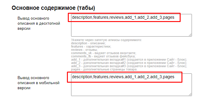 1. Вывод разделов в основном содержимом карточки товара управляются через опцию "Вывод основного описания в десктопной версии" (раздел Карточка товара/Основное содержимое (табы)). В опции в нужном порядке перечисляются (через запятую, без пробелов) алиасы разделов: