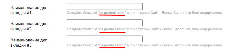 3. В основное содержимое карточки товара можно вывести до 3х произвольных вкладок (алиасы add_1, add_2 и add_3). В настройках темы дизайна заполните заголовки дополнительных разделов: