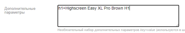Seo-заголовок H1 Если есть необходимость вывести отличное от наименования товара содержимое в тег h1, то используйте дополнительный параметр h1=Заголовок на странице товара в настройках товара:Результат: