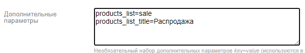 3. Для дополнительного списка, необходимо указать ID списка товара в дополнительных параметрах товара в параметре products_list=ID списка товара и для заголовка списка параметр products_list_title=Заголовок списка: