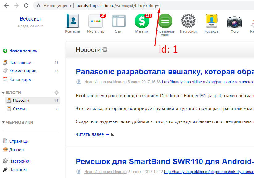 Идентификатор блога Чтобы узнать идентификатор (ID) блога, в админке перейдите на страницу нужного блога, в адресной строке появится параметр blog, его значение и есть идентификатор. Например, на скриншоте показан Блог с идентификатором: 1