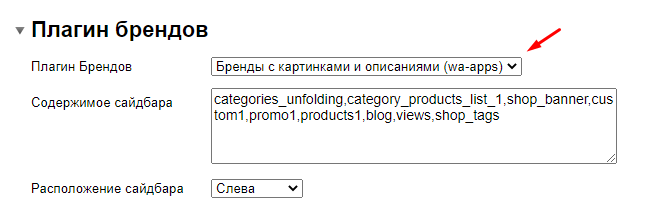 1. В настройках темы дизайна переключите опцию "Плагин Брендов" на вариант "Бренды с картинками и описаниями (wa-apps)":