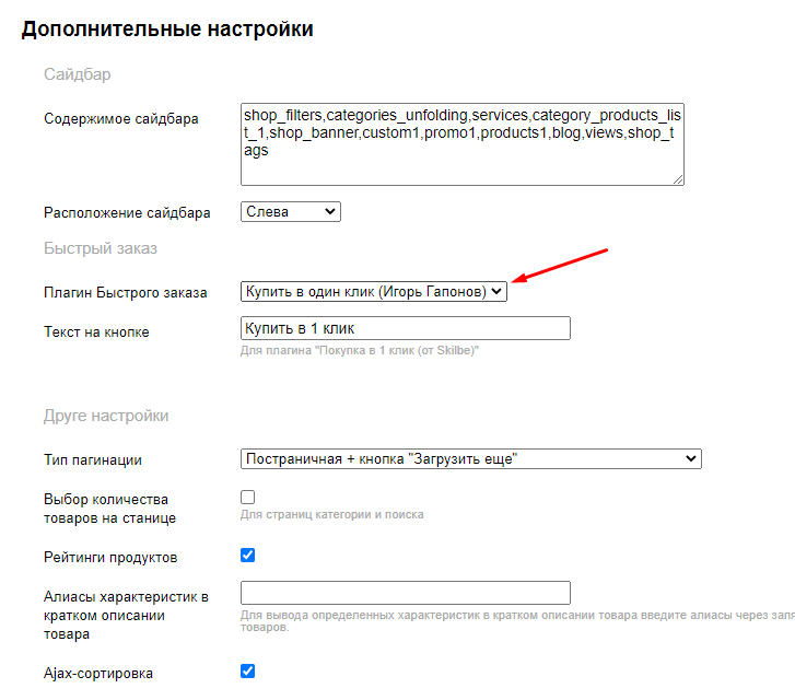 Для вывода кнопки Быстрого заказа, в настройках темы дизайна для опции "Плагин Быстрого заказа" выберите вариант "Купить в один клик (Игорь Гапонов)":