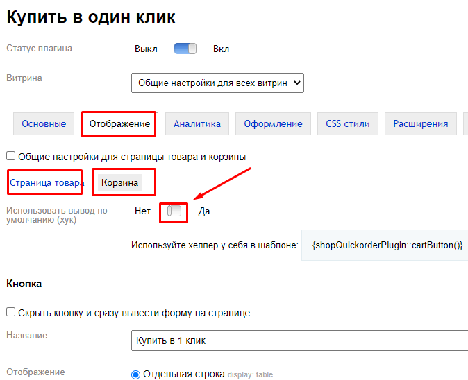 2. В настройках плагина (приложение Магазин - Плагины - Плагин "Купить в один клик") отключите опцию Использовать вывод по умолчанию (хук) в карточке и корзине:
