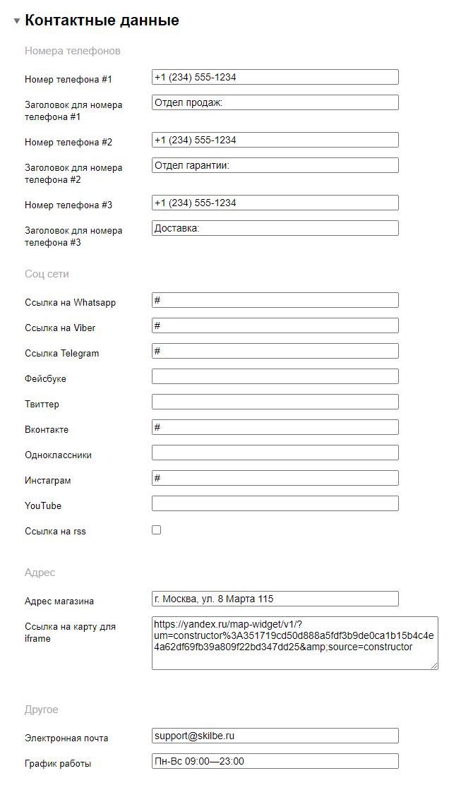 1. Данные для контактов заполняются в разделе "Контактные данные" в настройках темы дизайна: