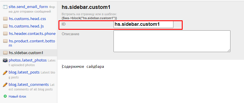 2. Далее, перейдите в приложение Сайт -> Блоки и создайте новый блок с идентификаторами hs.sidebar.custom1 (для первого блока) и hs.sidebar.custom2 для второго блока: