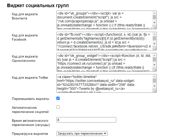 1. Виджет формирует блок с группами соц. сетей и возможностью переключения между ними и автоматической перемотки. Настройки расположены в разделе Блоки сайдбара/Виджет социальных групп: