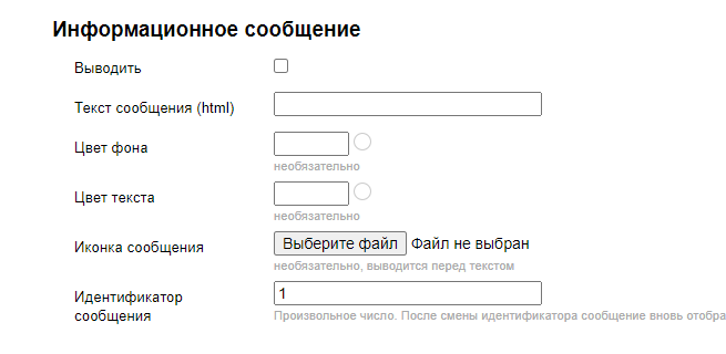 Для информационного сообщения можно задать текст (поддерживает html, можно задавать ссылки), цвет фона, цвет текста, иконку и идентификатор. Сообщение показывается единожды каждому пользователю, уникальность управляется идентификатором, т.е. при смене идентификатора сообщение будет вновь показано всем пользователям (новое сообщение).