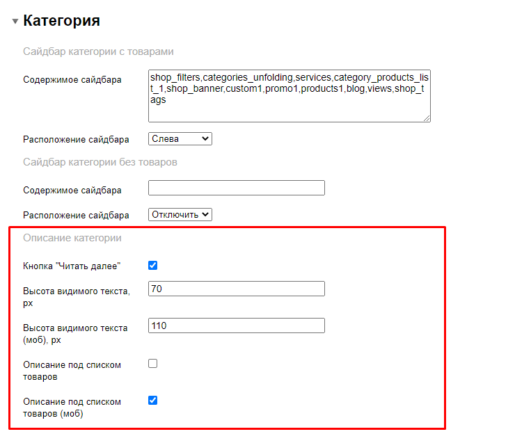 2. Опция "Кнопка "Читать далее" выводит соответствующую кнопку, при нажатии, на которую разворачивает полный текст описания категории. Высота текста определяется опцией "Высота видимого текста, px". Для того, чтобы текст сразу отображался полностью отключите опцию "Кнопка "Читать далее".