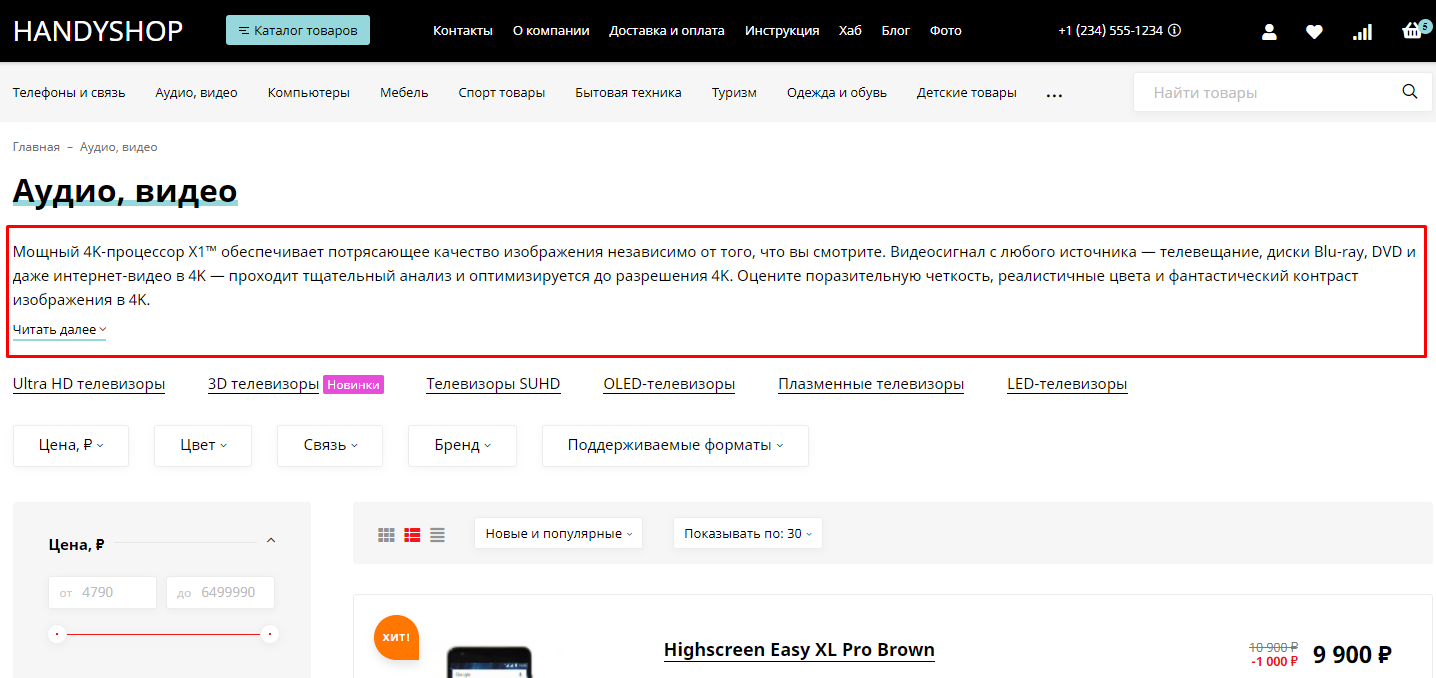 3. При необходимости описание можно перенести под список товаров, опцией "Описание под списком товаров" и "Описание под списком товаров (моб)".